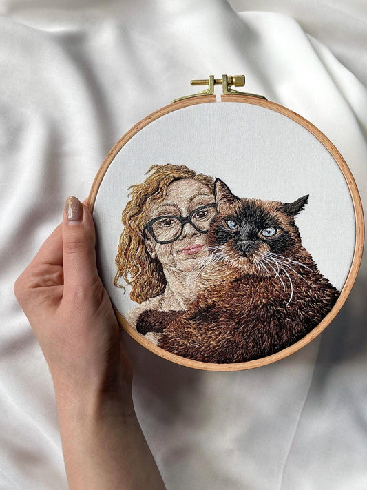 People portrait embroidered hoop, embroidered photo, people embroidery design, cat embroidery, embroidery portrait, pet embroidered gift