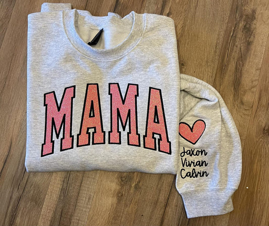Embroidered Applique Glitter Mama Sweatshirt with Kids Names on Sleeve