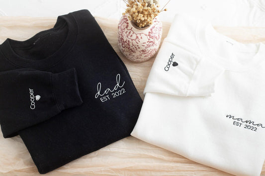 Embroidered Mom/Dad Sweatshirt. The sleeves can be customized with the children's names. this sweatshirt, you will not only feel the comfortable fit, but also remember the love and companionship of your children at all times. Each name is an invisible bond between you and your child, making every outing full of pride and warmth. this sweatshirt is not only a piece of clothing, but also choosing a way to cherish family memories. Embroidered Mama Sweatshirt allows the story of love to continue in every moment of life.