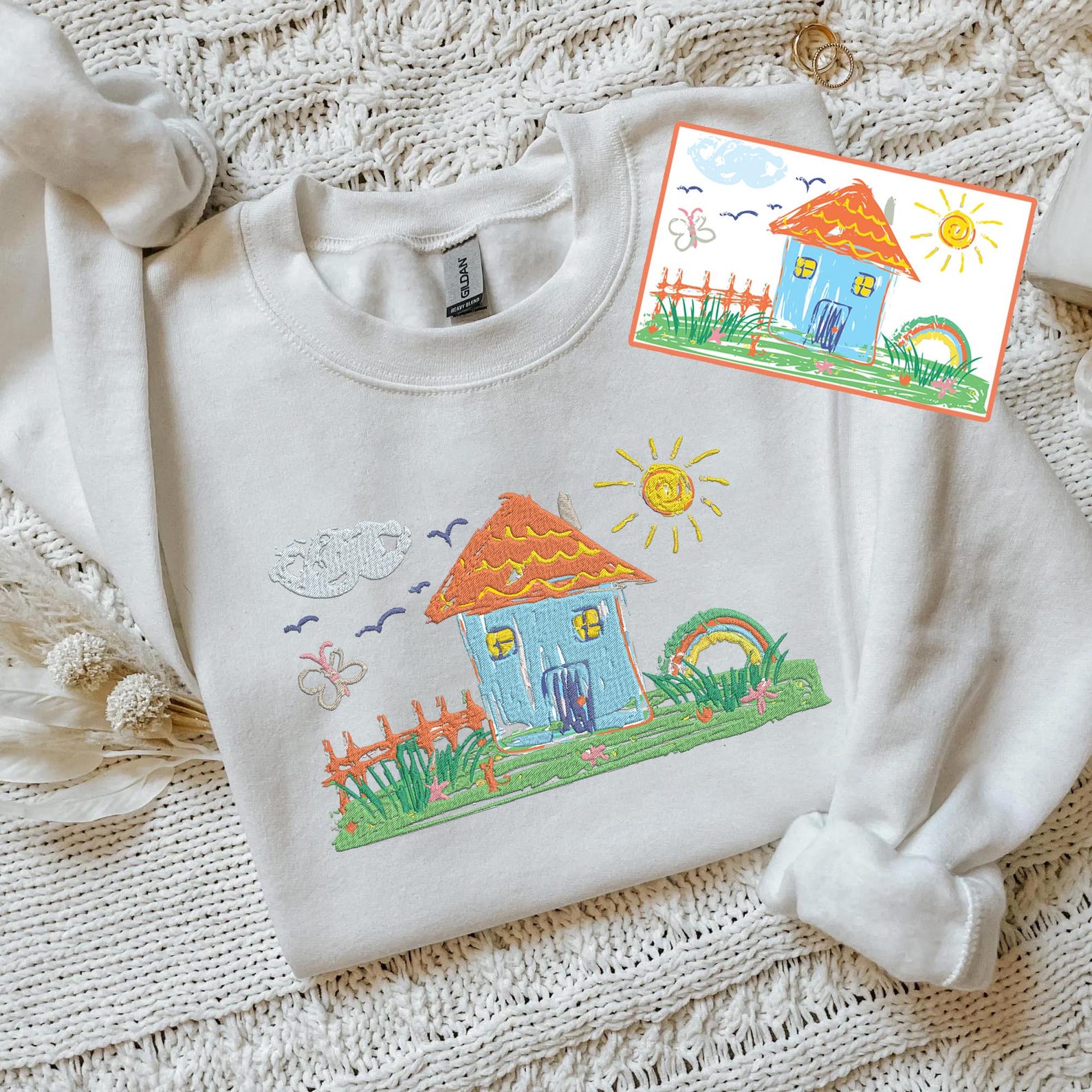 Custom Embroidered Family Portrait Sweatshirt - Personalized Kids' Drawing to Wearable Gift for Mom, Dad, Grandma - Outline Crewneck Hoodie