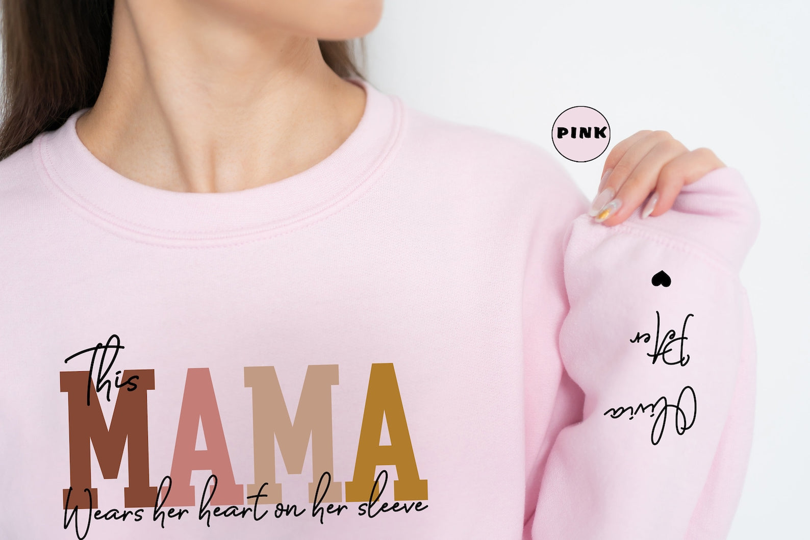 Custom This Mama Wears Her Heart On Her Sleeve Hoodie, Personalized Mom Sweatshirt With Kids Names, Cute Momma Outfit, Mothers Day Gifts