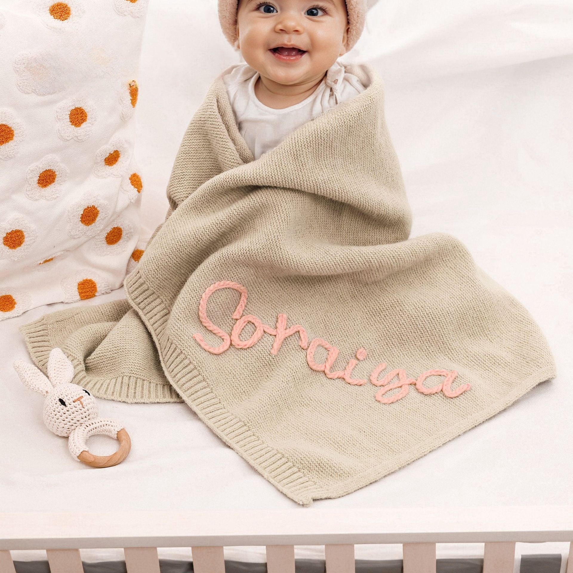 This adorable Embroidered Baby Blanket is made from ultra-soft cotton knit fabric, ensuring gentle comfort for your little one. Perfect as a custom baby name blanket, it can be personalized with a name, date, or sweet message, making it a unique and sentimental keepsake.